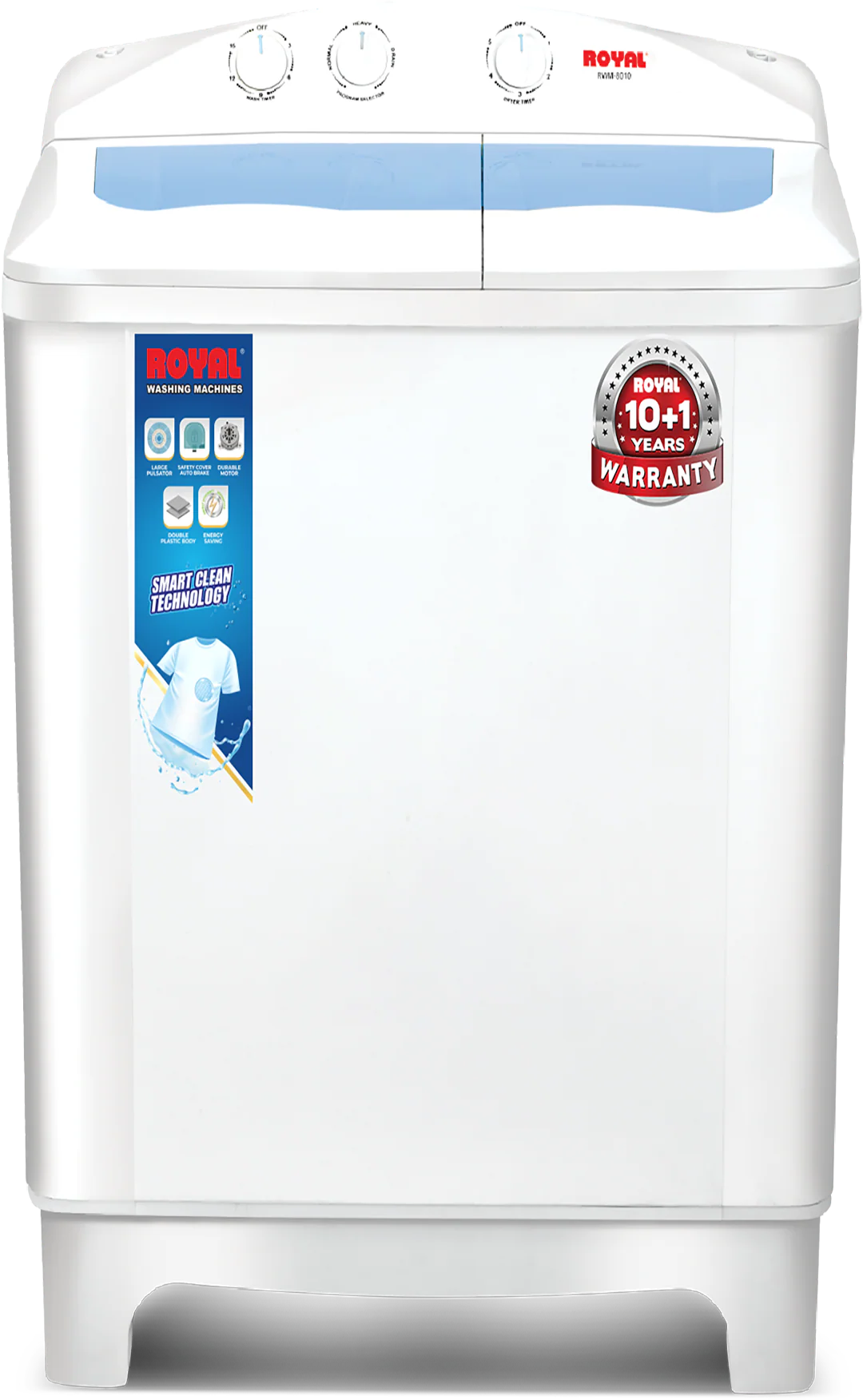 The Royal RWM-8010 is a semi-automatic twin-tub washing machine designed for small to medium households needing a reliable washer and spinner combination. It offers approximately 8.5 kg washing capacity, making it suitable for everyday clothes, towels, and mixed garments. The machine employs a robust wash mechanism — a large pulsator (sometimes referred to as “Ultra-Force pulsator”) combined with a dynamic wash drum — to deliver effective cleaning while being gentle on fabrics. Its full plastic, rust-proof body is designed for durability and low maintenance, ensuring resilience in regular home use. The design emphasizes efficient water and energy use, user convenience, and long-term reliability.